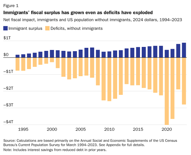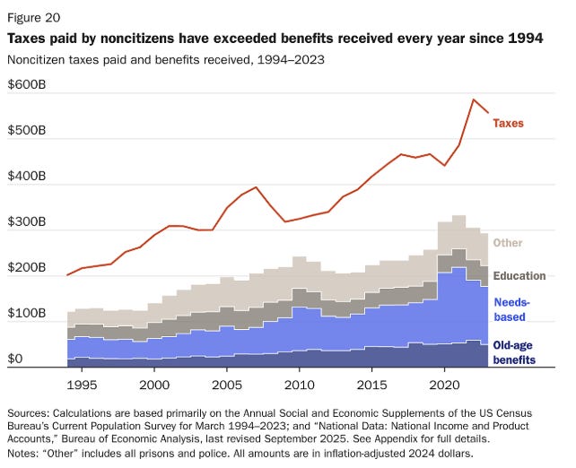 The Cato Institute is a Libertarian think tank that recently analyzed the economic impact of immigrants from 1994 through 2023. They found that immigrants paid more in taxes than they received in government benefits every single year.